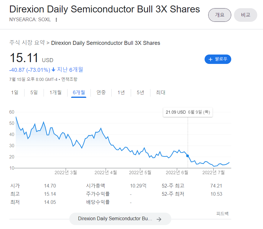 SOXL은 이 필라델피아 반도체 지수 하루 등락폭의 세 배를 따라가는 상품입니다. 세 배 짜리 레버리지인 만큼 오를 땐 많이 오르고 떨어질 땐 많이 떨어집니다.